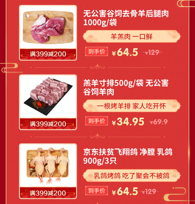 国内其他产品,无公害谷饲去骨羊后腿肉2斤装,到手价64块5;国家队同款出口日本级凤祥鸡翅中1公斤44.95元到手;新疆阿克苏冰糖心苹果4公斤到手价50元;京东扶贫飞翔乳鸽3只64.5元,而且都享受满减优惠。