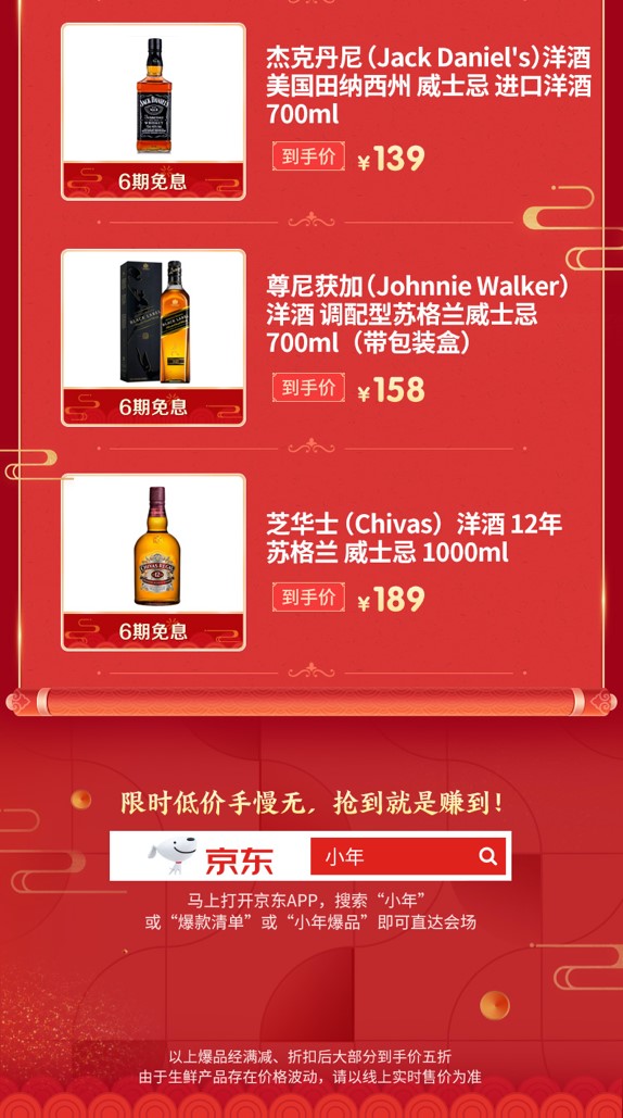 当然除了传统的白酒和红酒之外,想品味不同美酒的朋友们,也可以来京东年货节看看!来自美国田纳西州的杰克丹尼威士忌进口洋酒700ml,一瓶仅139元;尊尼获加调配型苏格兰威士忌700ml,更是158元拿到手,1000ml的芝华士12年苏格兰威士忌,到手价189元,而这些美酒佳酿均享6期免息,过年买给亲友,让他们也尝尝不一样的外国美酒!