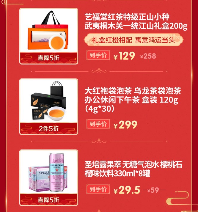 如果亲朋好友不喝酒的话,可以送上茶品、饮料,也绝对有心意!圣培露果萃樱桃石榴味饮料330ml*8罐仅售29.5元,川派茉莉花茶礼盒装250克/盒,3分茶香7分花香,到手价仅售129元!艺福堂红茶特级正山小种武夷桐木关一统江山礼盒200g到手价也仅129元,红橙相配,寓意鸿运当头,大红袍袋泡茶乌龙茶袋泡茶120g仅售299元,2件仅需5折!过年送长辈好茶好酒,聚餐大家开怀畅饮!
