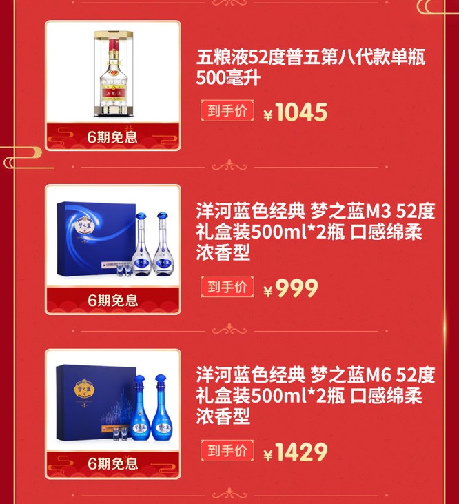 京东的这些超值酒品,绝对实惠,过年买来走亲访友,绝对是诚意满满!像家喻户晓的五粮液52度普五第八代单瓶500毫升装,京东年货节到手价1045元,送给长辈、好友既上档次,又有年味儿!而洋河蓝色经典梦之蓝M3 52度500ml*2瓶礼盒装,口感绵柔浓香型,到手价也仅999元,同等规格的洋河蓝色经典梦之蓝M6 52度礼盒装,到手价仅售1429元,而且这些酒品都是6期免息哦,超值而又划算!过年送好酒,来年样样有!