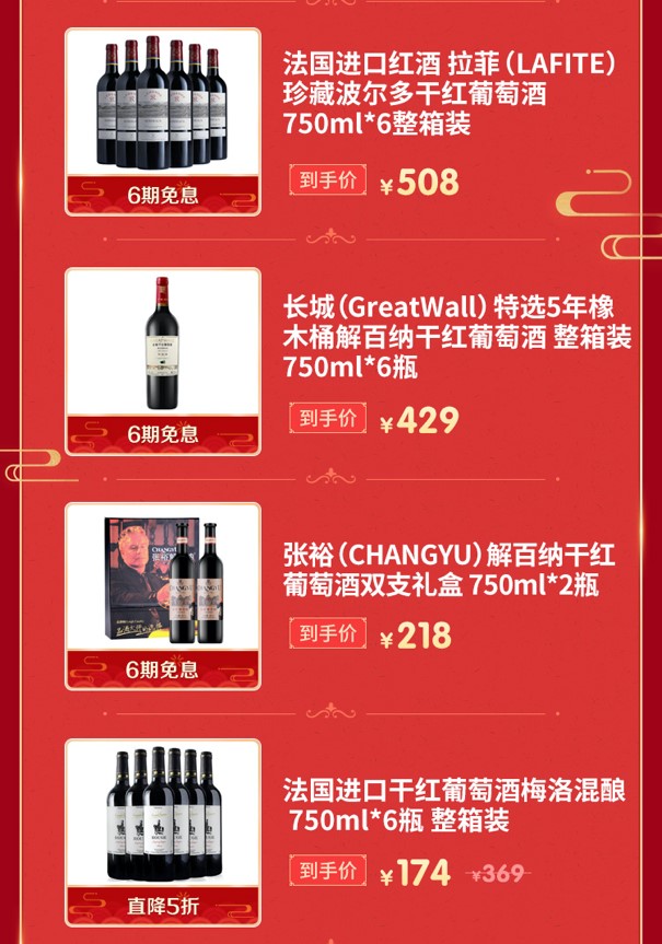 除了白酒,现在中国人的餐桌上也有了红酒的身影,逢年过节小酌一杯,好不惬意!像法国进口拉菲珍藏波尔多干红葡萄酒750ml*6瓶整箱装,508元即可到手,简直是神仙价格!还有备受国人喜爱的长城特选5年橡木桶解百纳干红葡萄酒,同样是750ml*6瓶整箱装,也仅售429元,一瓶才约合70块钱,整箱买给亲友也是实惠又高端!此外,张裕解百纳干红葡萄酒双支礼盒装,218元即可到手,更有法国进口干红葡萄酒梅洛混酿直降5折,174元能拿走750ml*6瓶一整箱!