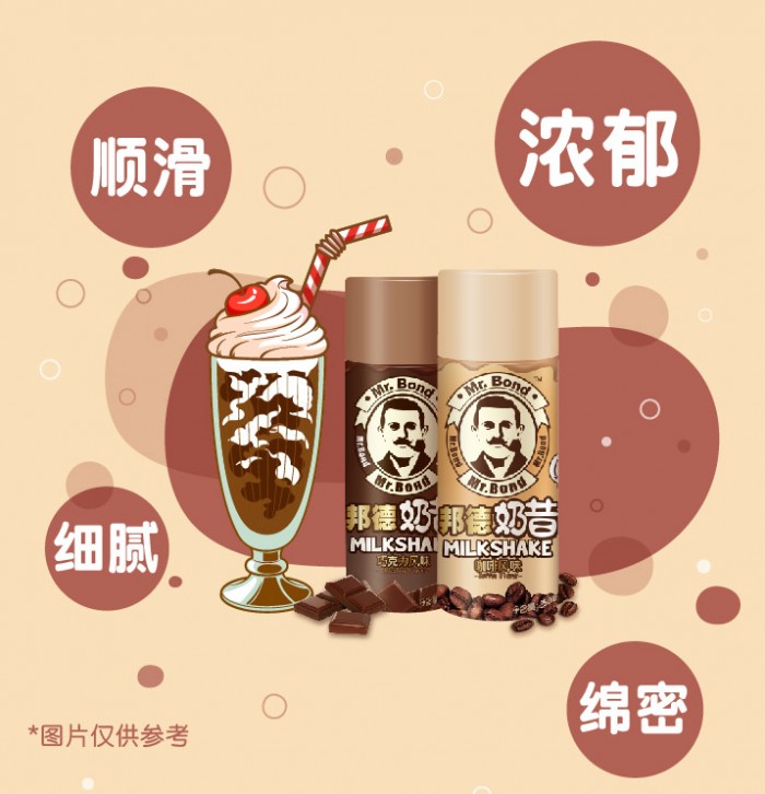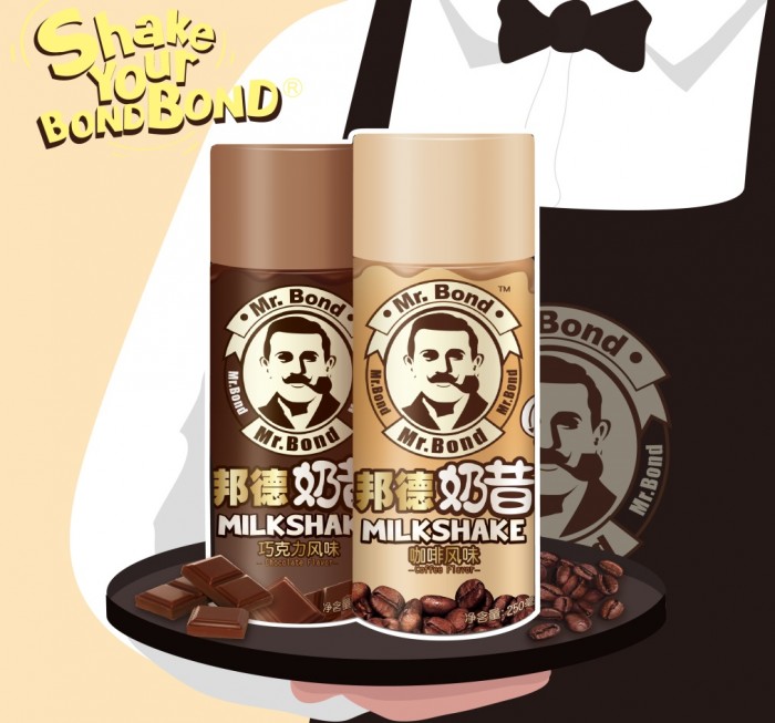 区别于一般的杯装奶昔产品,邦德奶昔采用瓶装,更轻快、更易携。而设计风格上,邦德奶昔延续了邦德系列的设计主调,时尚精致,简明大气,标志性的Mr.Bond头像更是进一步凸显了产品的高级感。瓶口上还印有奶昔纹样,寓意着美味挡不住的设计理念,能够强势吸引年轻群体的目光。