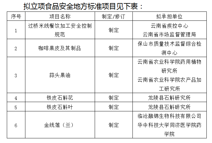 根据《食品安全法》及有关规定,我委组织开展了2019年食品安全地方标准制修订立项建议征集工作。经研究,2019年我委拟计划立项制定《过桥米线餐饮加工安全控制规范》《咖啡果皮及其制品》《蒜头果油》《铁皮石斛花》《铁皮石斛叶》《金线莲(兰)》等6个食品安全地方标准。现向社会公开征求意见,请于2020年1月23日前将有关意见反馈至我委食品处。