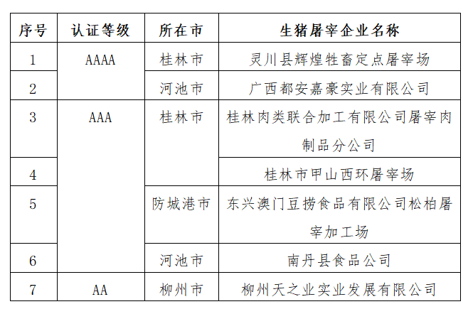 广西第四批生猪屠宰企业分级认证名单
