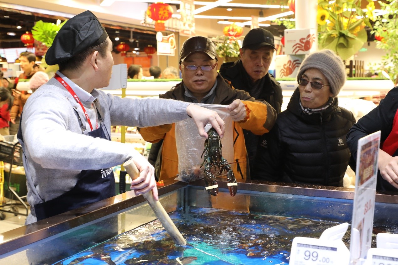 想吃到最最新鲜的活龙虾,可以直接到店购买,还可以当场加工,现场享用。超市3公里内的消费者也可以在7FRESH APP内下单,生鲜爆品一键享受送货上门的服务。