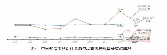 中烹协在报告中指出, 2019年,全国餐饮收入增速高于社会消费品零售总额增幅1.4个百分点;餐饮规模占社会消费品零售总额的比重为11.3%;对社会消费品零售总额增长贡献率为13.1%,拉动社会消费品零售总额增长1个百分点。