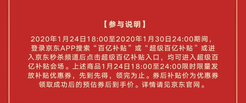 别怪小编没提醒你啊,1月23日这些超级百亿补贴爆品将在京东秒杀贺岁版块正式上线,大家可以提前加购。1月24日18:00,登陆京东APP搜索“百亿补贴”或“超级百亿补贴”,或进入京东秒杀频道点击超级百亿补贴入口均可进入优惠会场,补贴优惠券先到先得,小伙伴们,是时候展现你们的手速啦!当然,京东超级百亿补贴惊喜不止除夕夜,一直到1月30日24:00,也就是大年初六晚上24点,还有更多爆品超低价等你抢。