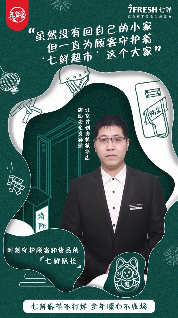 “虽然没有回自己的小家,但我守护的却是七鲜超市这个大‘家’。”孙然说,在部队中他曾数次接受紧急任务,在台风危险来临前,转移飞机、保护空军财产安全,今年的春节,他再次签下了军令状,前往了维护门店春节安全的 “战场”。