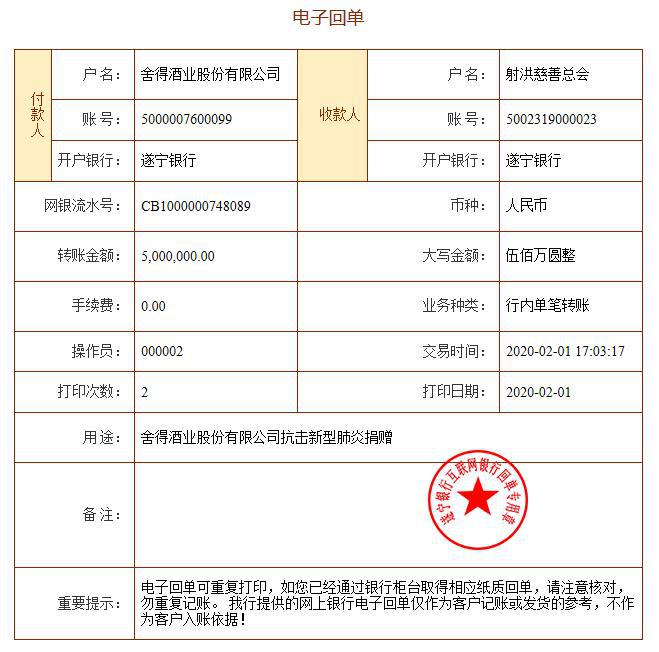 据了解,舍得酒业向武汉慈善总会捐款500万元用于采购短缺的医疗设备及物资,以此为抗疫一线医疗工作者提供支持和保护,助力早日打赢这场全民战“疫”。 同时向射洪慈善总会捐款500万元,主要用于支持当地新冠肺炎疫情防控。