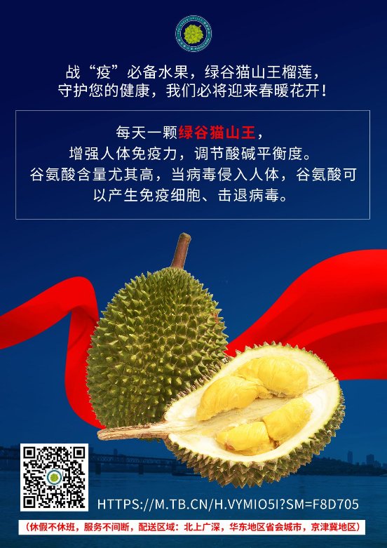 绿谷猫山王榴莲,在这悠长的宅家假期,为每一位顾客准备了新鲜健康的榴莲现货储备(配送区域可达:北上广深,华东地区省会城市,京津冀地区),让您保有身体抵抗力和免疫力。与此同时,绿谷猫山王不漠视你的无趣与忧心,在不能出门的日子里,除了刷剧看书,不妨把剥下的榴莲外壳煮煮水,炖炖汤,绝对是败火上品,也把厨房变成你的一块治愈小天地。为了早日“春暖花开”,让我们一起关注健康,提高自身免疫力!
