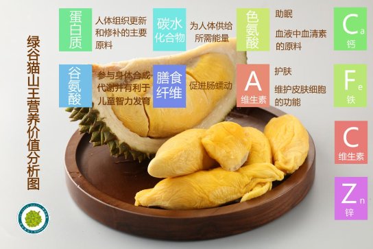 通俗一点说,猫山王榴莲富含谷氨酸,可以保有身体的抵抗力和免疫力,当病毒侵入人体,谷氨酸可以产生免疫细胞,击退病毒,这是其他水果无法比拟的。