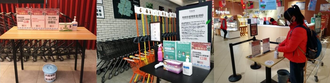 门口:超市入口处设置清洁台、口罩和消毒工具,顾客可免费使用免洗洗手液