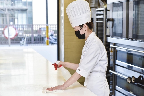 在门店,味多美统一配发足够的消毒液和 75℃ 酒精,按照消毒操作流程,按时对大门、地面、购物区域、操作车间、客用餐具等进行反复消毒。