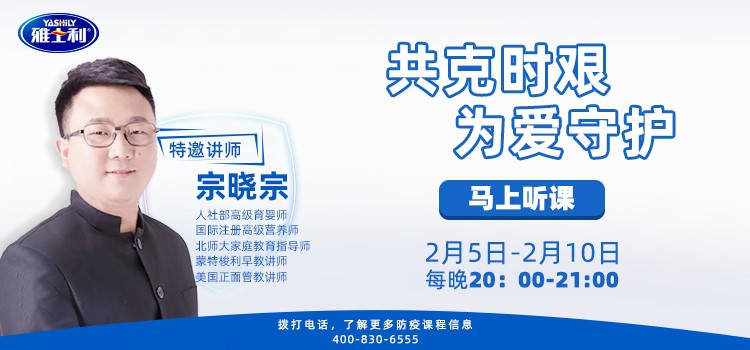 雅士利特别邀请人社部高级育婴师——宗晓宗,独家送上最全的防疫健康直播课程,用丰富的育儿、营养和早教经验,从生理和心理的多个角度,为宝爸宝妈们在线答疑解惑,让宝爸宝妈们宅家养娃、放心不焦虑,假期宅家更安心,与千万中国妈妈共克时艰。