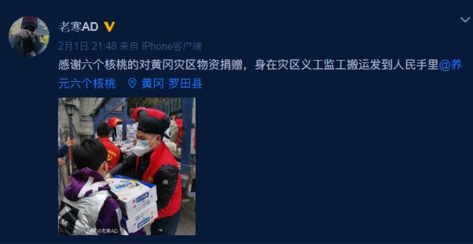 运输首日,六个核桃运送团队检测好体温,戴上口罩,穿上防护服,一路出城,开着满载支援物资的货车,火速驰援前线。然而湖北此时人力物力有限,六个核桃的运送队伍也遇到了不少困难。然而大家积极联络沟通,物资相继顺利送抵。来自黄冈市罗田县网友@老韩AD表示:“感谢六个核桃对黄冈灾区物资捐赠,我身在疫区义工监工,顺利把六个核桃搬运到人民的手里。”