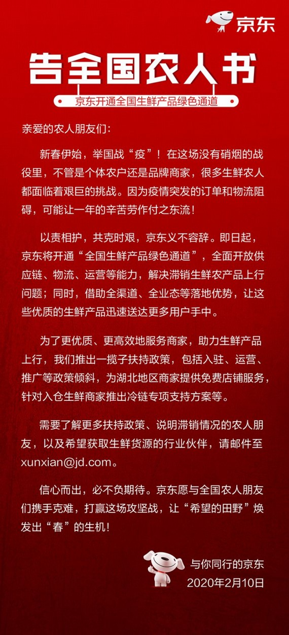 日前,京东针对疫情给各地农产区带来的困境,颁布“告全国农人书”,开启“全国生鲜产品绿色通道”。