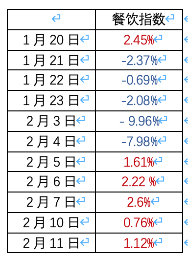但值得注意的是,自2月5日至1月11日,餐饮指数翻绿转红,出现回暖之象。广州酒家、海底捞、呷哺呷哺、味千中国、百胜中国股价下跌趋势也有所变缓,2月3日至2月11日,五家餐饮企业股价以正增加为多,即便出现股价下跌情况,下跌幅度与前期相比,大幅缩小。可见,但从股市来看,餐饮行业在疫情之下,有回暖迹象。