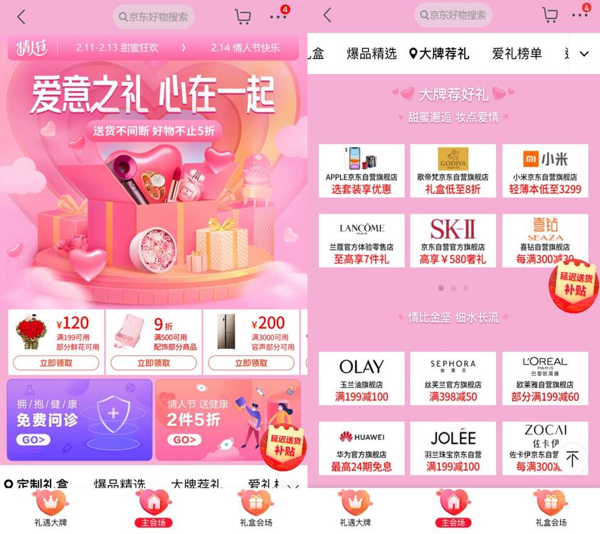 京东温情上线情人节专场,以“爱意之礼,心在一起”为主题,陪伴情侣们共同度过一场不一样的爱情盛宴。全场浪漫好物不止5折,钟表每满1000减150,领家电亿万津贴,至高减520。美妆满499减150,珠宝饰品低至5折,礼品每满300减30,奢品每满1000减150……各种心动好物,完美守护你的Ta。
