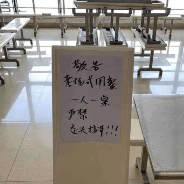 比如有些复工的公司有单位食堂,一改以前的热闹,安排了「高考式吃饭」、「分餐式吃饭」,吃饭吃出了考试的感觉,一人一桌,吃完就走,不许交谈。