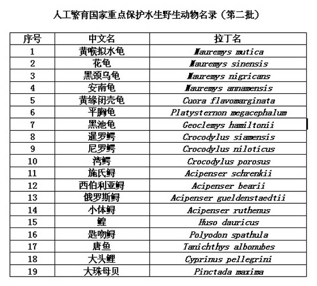 人工繁育国家重点保护水生野生动物名录(第二批)