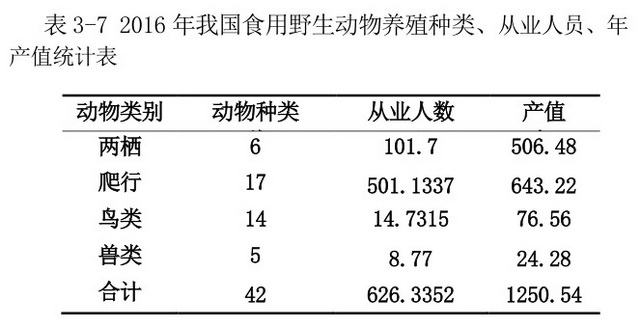 2016年我国食用野生动物养殖种类、从业人员、年产值统计表。资料来源:《中国野生动物养殖产业可持续发展战略研究报告》
