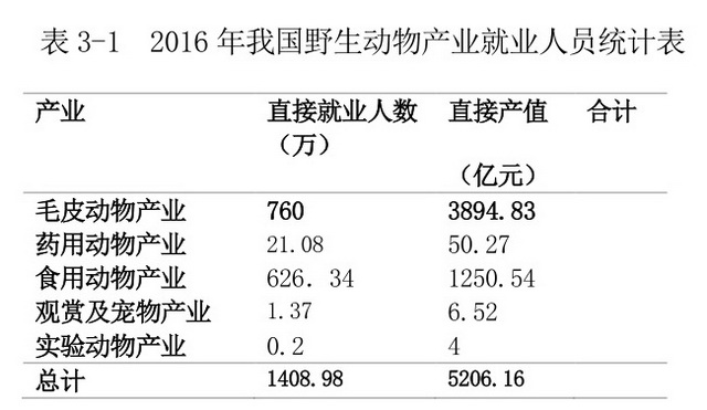 根据调查估算,2016年,全国野生动物养殖产业的专兼职从业者有1409多万人,创造产值5206多亿元人民币。其中,毛皮动物产业从业者约760万人,毛皮产业产值估算3894.83亿元;药用动物产业的从业者约21.08万人,创造产值50.27亿元;食用动物产业的从业者约626.34万人,创造产值1250.54亿元;观赏、宠物类产业的从业者约1.37万人,创造产值6.52亿元;实验灵长类动物产业直接从业者约2000人,创造产值4亿元。