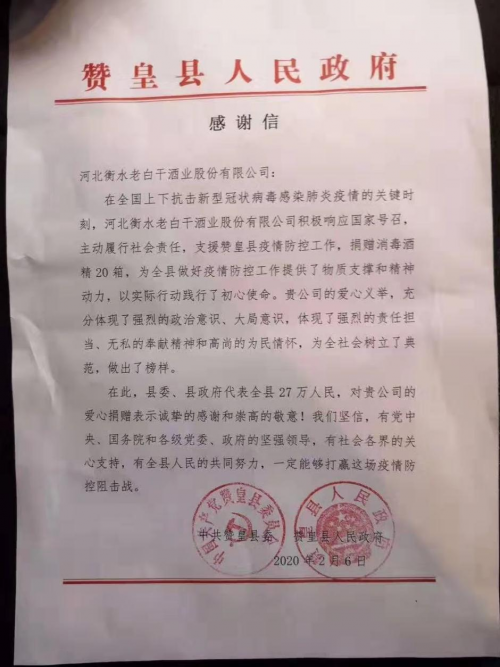 在当下严峻形势考验下,衡水老白干及下属企业积极响应,发挥自身优势,承担企业责任,以实际行动全力支持抗击新型冠状病毒的防治工作。据统计,河北衡水老白干酒业股份有限公司共计向湖北、河北两地捐赠380万元现金及大量浓缩消毒剂和居家专用消毒酒: