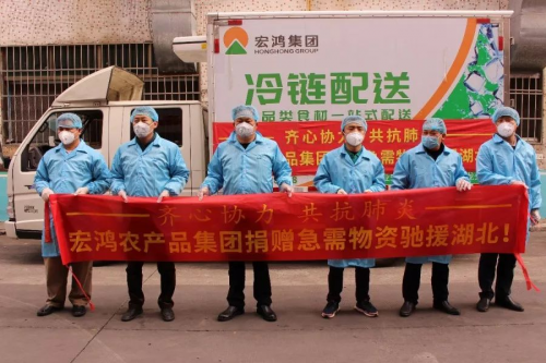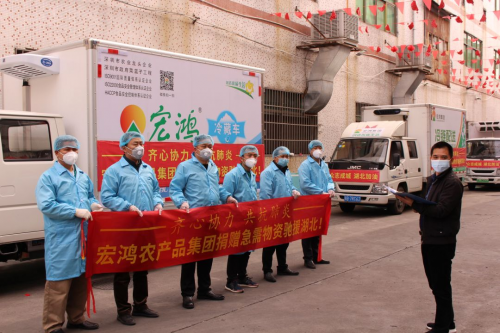 2月9日,挂着“齐心协力 共抗肺炎 宏鸿农产品集团捐赠急需物资驰援湖北”、“众志成城 湖北加油”横幅的爱心冷藏车,满载着近40000斤灾区急需物资从宏鸿农产品集团总部驶出,25个小时之后,第一批急需物资运抵湖北省孝感市。这批物资包括:猪肉、冷冻品、蔬菜等总价值近30万人民币的灾区人民急缺的农副产品。