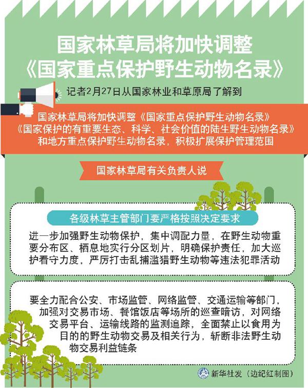 新华社北京2月27日电 记者27日从国家林业和草原局了解到,国家林草局将加快调整《国家重点保护野生动物名录》《国家保护的有重要生态、科学、社会价值的陆生野生动物名录》和地方重点保护野生动物名录,积极扩展保护管理范围。