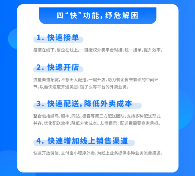 该系统能够帮助餐企快速接单、快速开店、快速整合线上配送资源,降低外卖成本,同时快速增加线上销售渠道。此外餐道还提供了小程序免费开通服务,这两项免费服务均会持续提供至疫情结束。