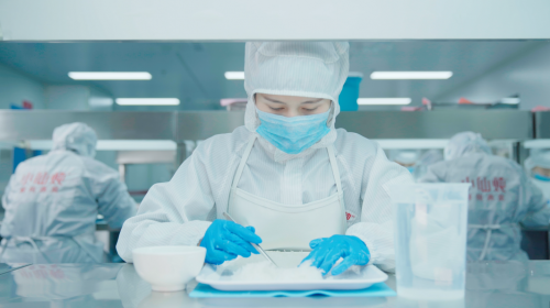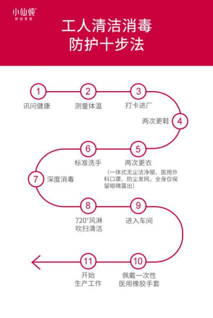 据悉,小仙炖鲜炖燕窝工厂的一线工人,从参与生产前均需经过10步的全方位消毒和防护,包括逐个测量体温、询问健康状况后打卡进入工厂。之后,员工需经历两次更鞋、两次更衣(一体式无尘洁净服、医用外科口罩、防尘发网)、标准洗手流程、一次深度消毒、720°风淋吹扫清洁后进入车间,佩戴好一次性医用橡胶手套进入生产岗位。最终,工人全身仅露出眼睛,非常严密卫生。