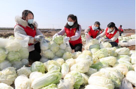 2020年3月5日,江苏省连云港市赣榆区石桥镇新时代文明实践志愿服务队帮助受疫情影响而缺少帮工的家庭农场采收蔬菜,减少损失。