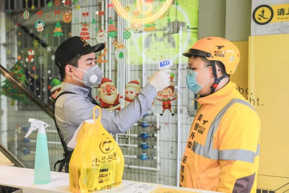 小田豆浆针对当前外卖配送流程进行了强化把控,增加了前置外卖取餐处,外卖小哥不用进入店内即可无接触取餐;对每一位配送的外卖小哥进行取餐消毒,测量体温;对店内打包人员进行严格的防护消毒要求,并做好餐用具的消毒工作;每餐对送餐包、热食柜进行消毒。