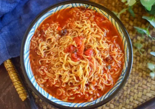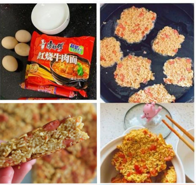 当然或者有更复杂的"红烧牛肉面一包,西红柿半个,鸡蛋一个,葱姜适量,老干妈一勺,泡面用热水泡开沥干水分,煎一个鸡蛋备用,趁着锅内的余油,加入番茄翻炒一会,加入适量的水,加入泡面中的调料,等水开了加入泡面煮几分钟,一碗黄金高端泡面就正式出锅了……"