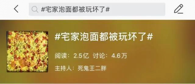 今年春节期间,微博上#宅家泡面都被玩坏了#这一话题阅读量高达2.5亿,相关讨论4.6万条。有网友看完表示,"碗里的泡面突然就不香了"、"我已经不满足于单纯的煮泡面了"、"方便面加上黑椒酱,煮了点青菜干拌吃出了意大利面的滋味"、"方便面成功不方便"。在这个话题下,除了方便面的传统吃法,方便面煎饼、方便面披萨、泡面芝士火腿等鬼畜玩法层出不穷。