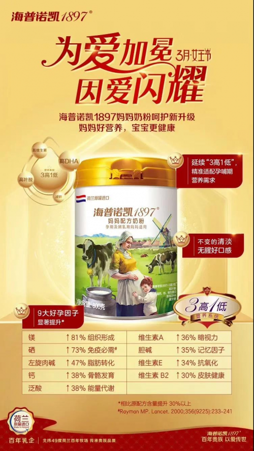 为更好的满足孕妈妈营养需求,海普诺凯1897妈妈奶粉配方全新升级,特邀荷兰营养专家潜心研发,对营养素科学配比、含量优化调整,帮助妈妈全面、科学、合理的储备营养,满足宝宝营养所需。