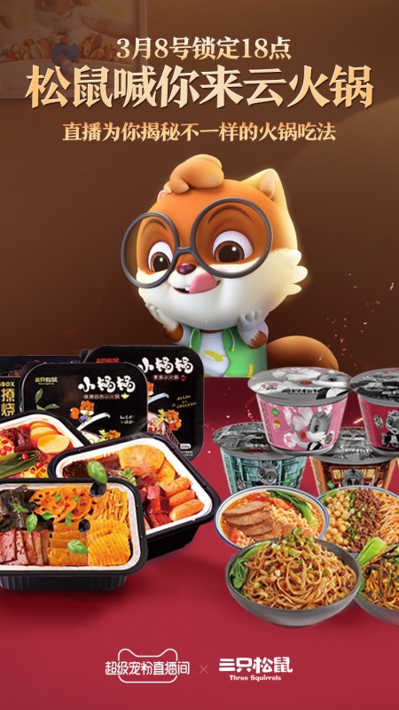 为解决疫情期间粉丝宅在家中迫切想吃火锅的需求,3月8日,三只松鼠品牌部首次联合天猫品牌号打造“超级宠粉直播间”,并发布#松鼠来喊你云火锅#话题,开展粉丝宠爱专场活动。在直播中,三只松鼠将自家零食涮入火锅,不仅引起粉丝的好奇,更成功激发起粉丝的参与热情。