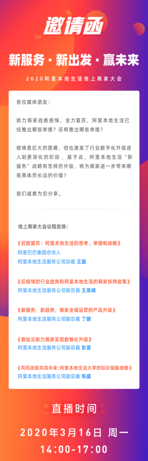 3月16日下午14:00开始,阿里本地生活将召开一场线上的商家大会。