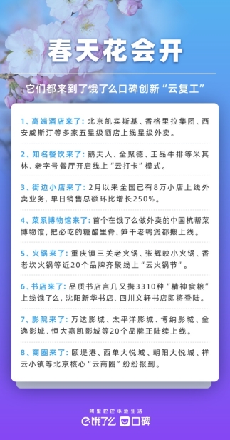 在口碑平台,书店、美发等到店消费正在逐步回升,订单量环比增长800%和360%,不少商户还纷纷尝试直播等新型营销方式,数字化正在成为行业恢复重振的最佳路径。