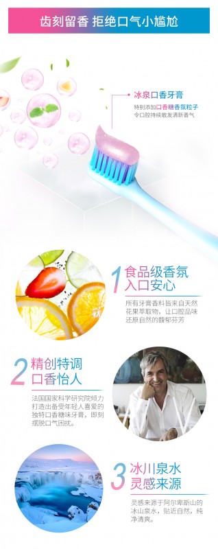 冰泉牙膏包装产品做到了年轻、炫彩、时尚和灵动,泉爽白、泉养龈、碧玺净三大系列,满足不同口腔需求,另外儿童牙膏特别添加益生菌成分,平衡菌群,呵护儿童牙齿。为了打造高品质产品,让牙膏有更好的口感,冰泉在产品中添加了来自于法国阿尔卑斯山的冰川水,其富含多种微量元素,弱碱性保护口腔健康;另外还和法国日化研究院进行联合研究,不断对牙膏的口感和留香进行升级,添加口香糖粒子,瞬间释放香氛魔力,带来前所未有的口香体验;同时还和奇华顿、德之馨、芬美意和曼氏等世界顶级的香精公司合作,力图做最好的口香牙膏。