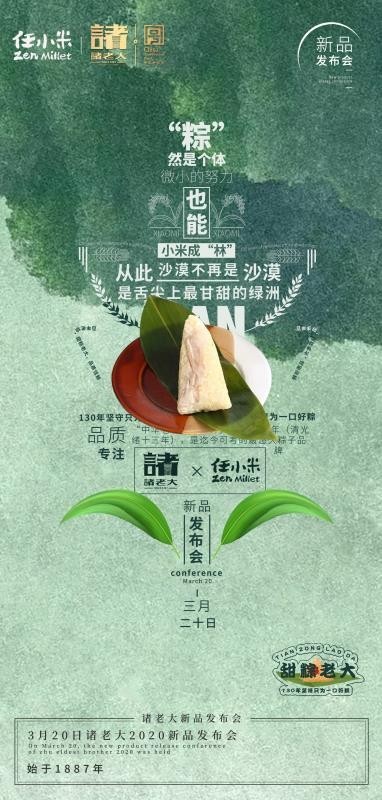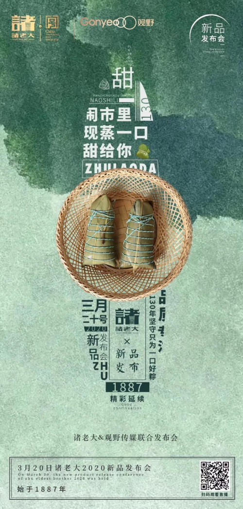 身为餐饮行业人,我不禁好奇,究竟是哪家品牌具有如此影响力?打开海报定睛一看,原来是传承一百多年制粽工艺的中华老字号、甜粽老大——诸老大,此次宣传海报目的就是为即将到来的新品发布会进行预热。