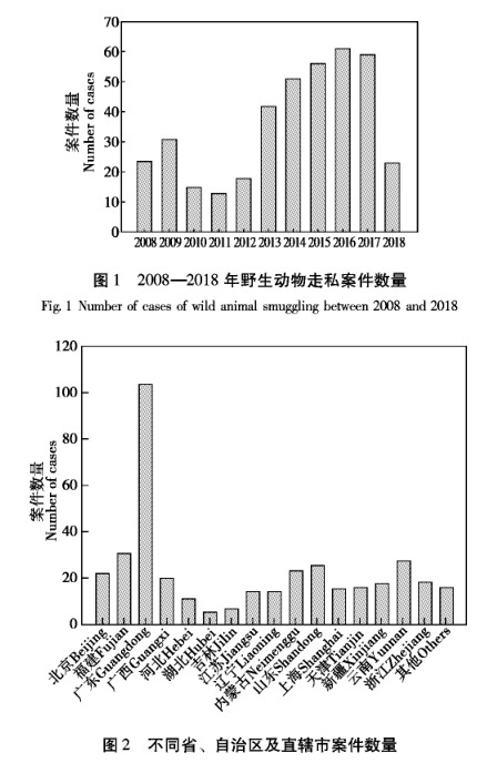 2019年8月,中国林业科学研究院林业科技信息研究所王文霞、陈绍志等专家专门就“近年我国海关打击野生动物走私状况”进行了分析。据统计,2008~2018年间中国海关总署官方网站公布的野生动物及其制品非法走私案件的数量为390件。不同年份的案件数量有所差异,其中2016年案件数量最高,为61件,2011年案件数量最低,为11件。