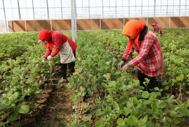 2020年3月20日,江苏省连云港市赣榆区塔山镇土城村农民在大棚内管护猕猴桃苗。