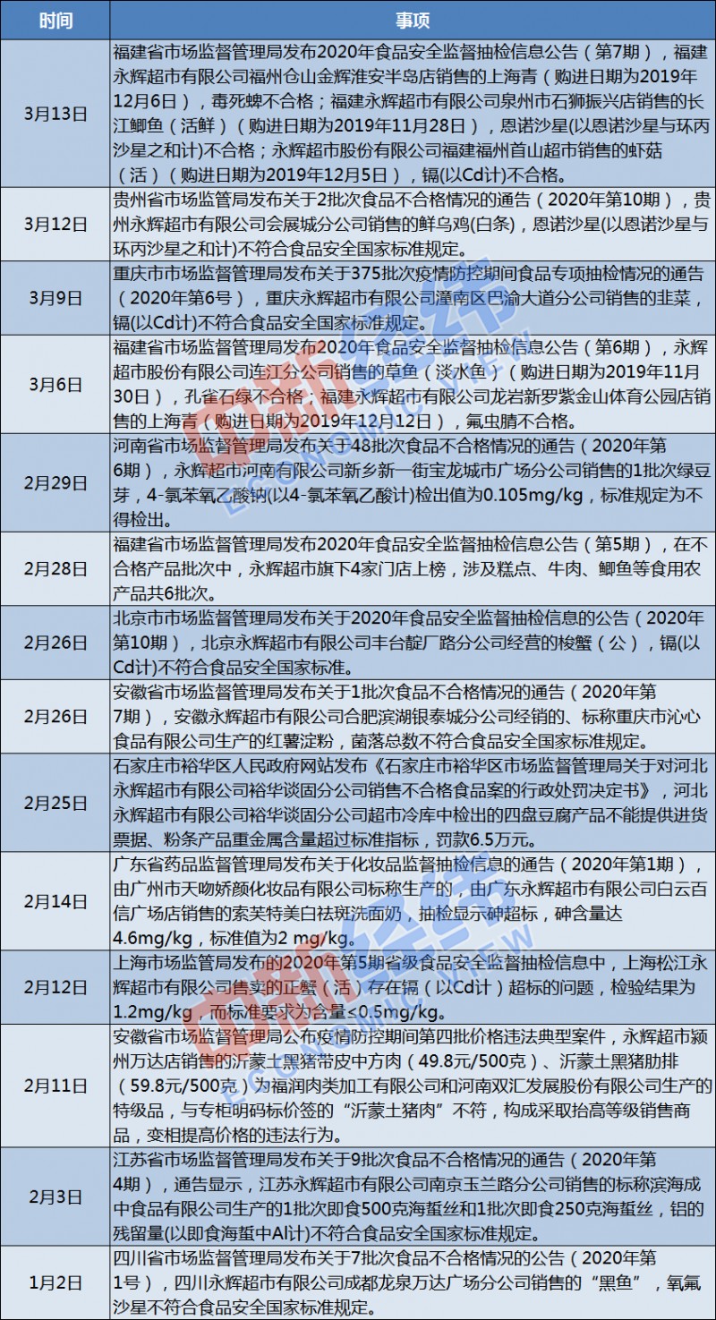 据中新经纬记者不完全统计,包括上述连续两日被地方市监局点名在内,今年年初至今,永辉超市已至少14次登上各地市监局抽检黑名单或被市场监管部门通报。