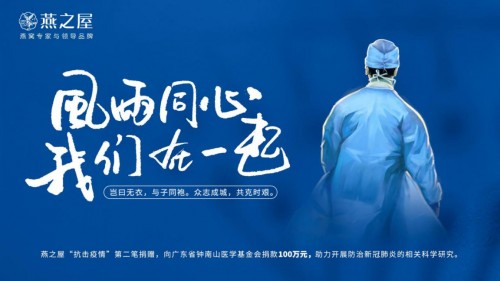 1月26日,武汉封城第三天,燕之屋就第一时间向武汉市红十字会捐款 100 万元,用于新冠肺炎的防治和医疗工作。企业员工自发募款,之后为再向广东省钟南山医学基金会再捐 100万元,这次的方向更加精准——定向助力新冠肺炎疫情的科研攻关。