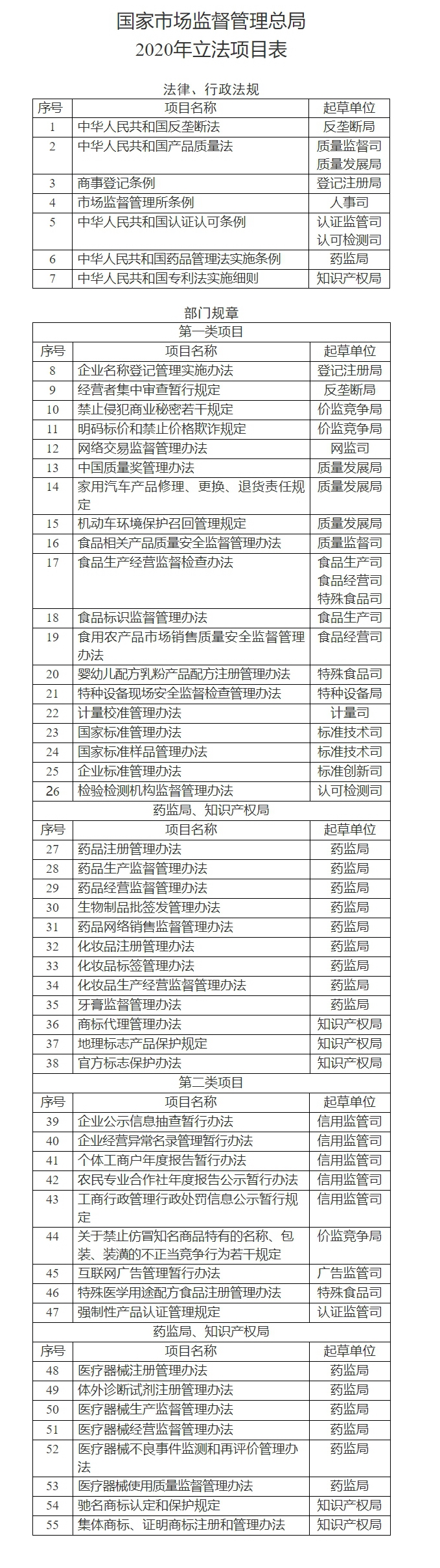 《计划》披露,2020年,市场监管总局拟起草法律、行政法规送审稿7部,包括中华人民共和国反垄断法、中华人民共和国产品质量法、商事登记条例、市场监督管理所条例、中华人民共和国认证认可条例、中华人民共和国药品管理法实施条例、中华人民共和国专利法实施细则。