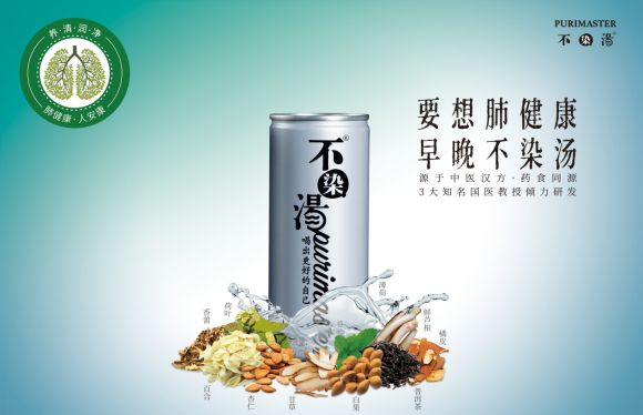 大唐汉方和中国烟草联合推出的不染汤,特别针对长期生活在吸烟、雾霾、粉尘、汽车尾气污染等环境问题中的人群,配方精选百合、白果、杏仁、橘皮、普洱茶等10味药食同源原料,以现代科学萃取方式提炼而成,100%纯植物,老年、青少年、孕产妇皆可饮用,四季常喝能提升肺部功能和活力、增强身体免疫力、有效防治肺部组织纤维化,清洁肺部、润肺止咳、祛痰缓急效果显著,是中医古老药食调理智慧的结晶,受到我国知名中医苏宝刚教授倾情推荐。