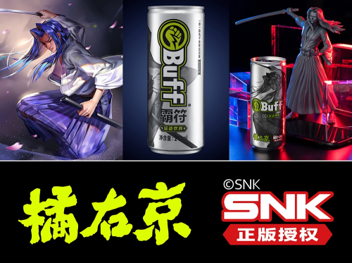 众所周知,IP在最近几年是市场的宠儿,尤其是年轻人群体对IP的追逐甚至超越了对品牌的追逐。一个个热门IP消费品的崛起,也让市场看到了IP的力量。Buff品牌和SNK达成了战略合作协议,拥有SNK旗下《拳皇》和《侍魂》2个热门游戏IP的所有角色IP使用权。Buff品牌的第一款产品「Buff能量型运动饮料」即采用了《侍魂》中的主要角色「橘右京」作为产品包装形象,而橘右京也是国民手游《王者荣耀》中的英雄角色。这让Buff产品不论是在线上的电商平台,还是在只有0.2秒决策时间的线下货架,都能瞬间抓住年轻人的眼球,拥有超越同类的销售优势。