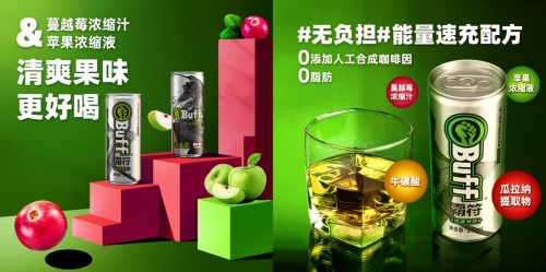Buff能量型运动饮料专为年轻生活方式研制,含有瓜拉纳提取物、牛磺酸,同时补充身体和大脑的能量,保持清醒和活力。而且Buff产品0脂肪、0添加人工合成咖啡因,经常喝也没有身体负担,迎合了年轻人的健康诉求。Buff能量型运动饮料还添加了蔓越莓浓缩汁和苹果浓缩液,清爽的水果味道也更对年轻人的流行口味。