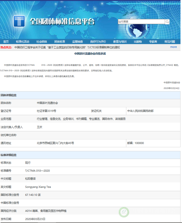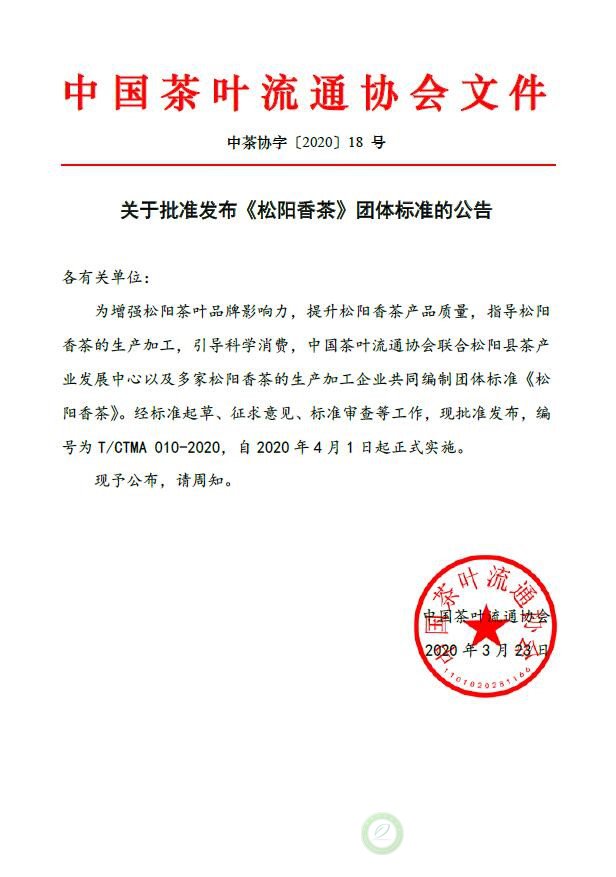 《松阳香茶》(T/CTMA 010-2020)团体标准已于2020年3月23日在国家标准委全国团体标准信息平台发布,并将于2020年4月1日起正式实施。松阳香茶作为我国绿茶的区域性代表产品,多年来凭借其高品质、高性价比等优势深受广大消费者喜爱。为了进一步提升松阳香茶品牌影响力,增强松阳茶产业综合竞争力,科学指导松阳香茶生产加工,中国茶叶流通协会与松阳县茶产业发展中心、松阳县茶叶产业协会等单位于2019年9月共同立项启动了《松阳香茶》团体标准编制工作。